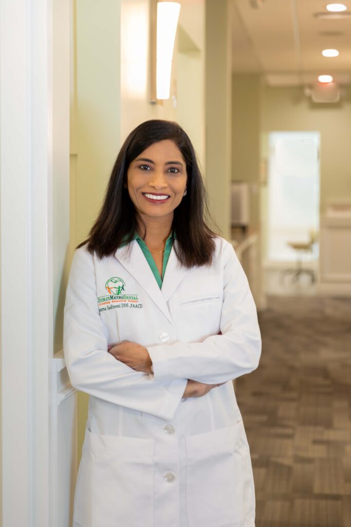 Dr. Aparna Sadineni, with over 28 years of experience in Cosmetic, General, and Implant dentistry, is dedicated to providing comprehensive, personalized care. She earned her DDS from the University of California, San Francisco, and completed a three-year postgraduate program in esthetic and cosmetic dentistry at the University of Minnesota. A Master of the Academy of General Dentistry (MAGD), Fellow of the International Congress of Oral Implantologists (FICOI), and one of only 87 Fellows of the American Academy of Cosmetic Dentistry (FAACD) worldwide, Dr. Sadineni is highly regarded for her clinical expertise and artistry in smile enhancement. Passionate about patient relationships and community service, she volunteers with programs like Give Back a Smile and Give Kids a Smile, and has served as President of the Ohio Academy of General Dentistry, continuing to lead as a Regional Director. Outside of dentistry, she enjoys movies, running—having completed seven half-marathons—and spending time with her husband Kishore, their two daughters pursuing dental careers, and Mo, their playful Golden Doodle who often greets patients at the office.